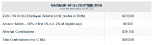How much can you contribute to this after-tax 401(k)? For example, if you are under 50 years of age and maximize your employee deferral amount ($23,000 in 2024), and Amazon matches $6,900 (assuming $350,000 salary), this would allow you to contribute $39,100 into your after-tax 401(k) as highlighted below.