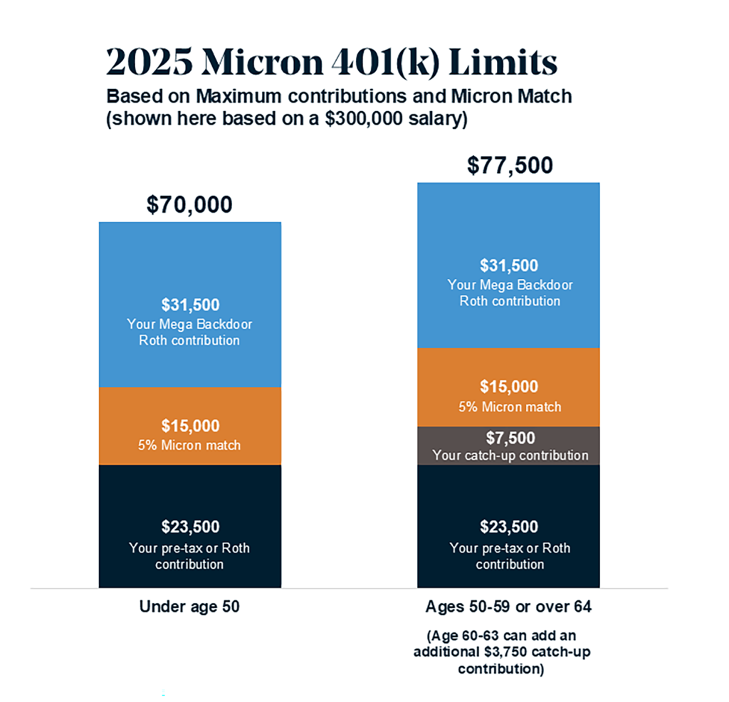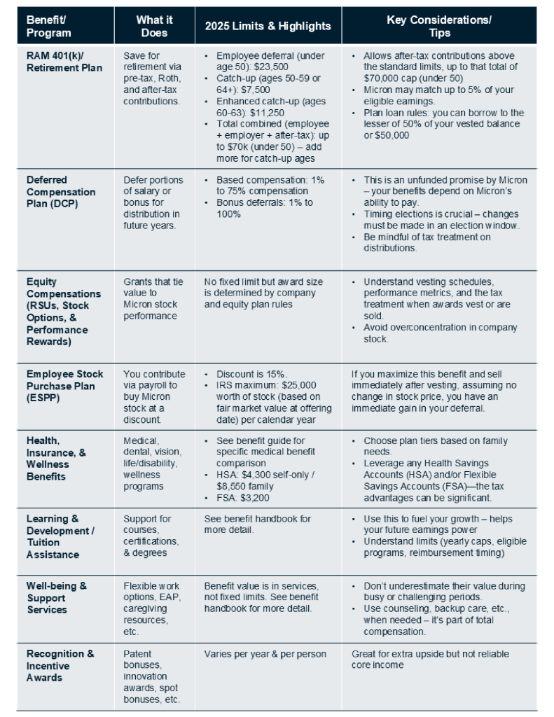 Yet, with so many options—from equity grants to deferred compensation and after-tax 401(k) contributions—it can be hard to know where to focus. The reality is, a few small adjustments can make a big difference over time. Below is a practical guide to help you understand Micron’s 2025 benefit programs, updated plan limits, and how to make each component work harder for you.