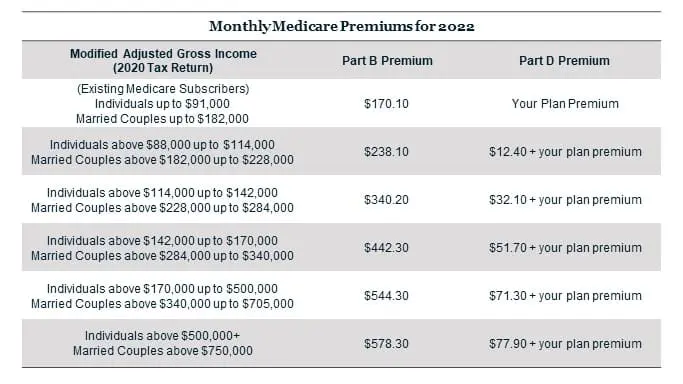 IRMAA stands for Income-Related Monthly Adjusted Amount and refers to the income-based adjustments to Part B and Part D premiums. Interestingly, IRMAA is based on your Modified Adjusted Gross Income from two years ago. The chart below explains how your 2022 Medicare premiums would be impacted by your 2020 income level.