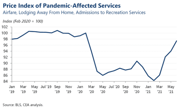 There can be no dispute that we have seen a year-over-year spike in inflation, with the Consumer Price Index rising 5.5% year-over-year in June. The Fed, however, considers this inflation transitory for several reasons. First is the “base effect” – measuring June 2021 inflation against June 2020 when the economy was predominately shut down. The base effect is apparent in services inflation. While year-over-year prices in services have significantly increased, prices have not yet returned to their pre-COVID levels.