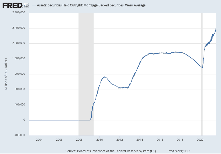The Fed played a large part in the recovery from the COVID-related recession by spurring lending to support struggling companies and consumers. It did so by moving the Fed Funds rate to zero, buying Treasuries, buying mortgages, and signaling, for the first time in history, that it would buy the debt of private companies. While the Fed is no longer buying the debt of private companies, it continues to buy Treasuries and Mortgage Backed Securities (called Quantitative Easing or QE) at a record pace: currently buying almost all the net issuance of Treasuries and a record amount of Mortgage Backed Securities: