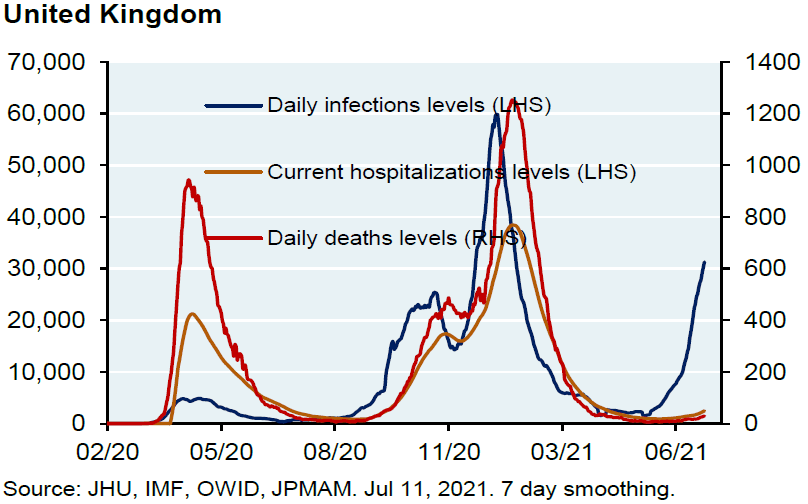 The United Kingdom is about five weeks ahead of the US in the spread of the Delta variant and has a similar vaccination rate to the US. So, its experience may well be instructive.