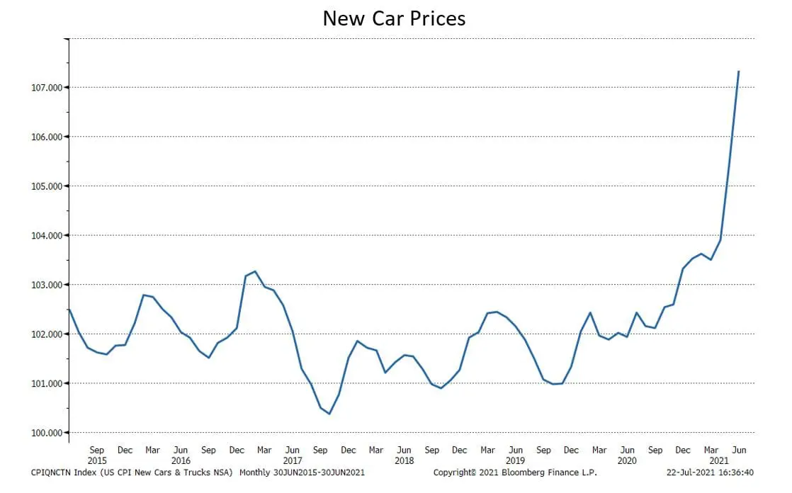 In addition to the base effect, the current increase in inflation is due to the supply/demand imbalance caused by the COVID-related economic shut down when supply was curtailed because demand was limited. Now with the economy recovering faster than expected, demand has dramatically increased, but supply has not caught up. The effect of this supply/demand imbalance is exemplified in new car prices. Car manufacturers cut new car production last year and are currently having difficulty ramping up production due to shortages of component parts. As a result, new car prices have skyrocketed as demand has outstripped supply: