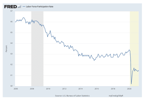 In explaining why the Fed should maintain such low rates in the face of what appears to be strong economic growth, Fed Chair Powell points out that although the unemployment rate has fallen from over 14% to 6%, 6% is still an elevated rate. In addition, the percentage of people participating in the jobs market has significantly declined and initial claims for unemployment also remain elevated.