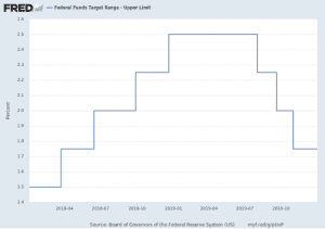 2018’s sharp contraction in valuation multiples reflected investor pessimism about future earnings growth, an outlook that reversed abruptly in 2019. While it is impossible to precisely determine the ingredients that constitute the stew of factors that move markets, it appears that two main ingredients were responsible for financial markets being negative in 2018 and positive in 2019: the Fed and trade policy. In 2018, the Fed steadily raised the Fed Funds rate four times, starting the year at 1.5% and ending the year at 2.5%. These sequential rate hikes progressively spooked financial markets, with the final December 2018 rate hike causing significant volatility in both equities and fixed income. Market participants feared that the Fed was moving too quickly and that higher interest rates could choke off the economic expansion.