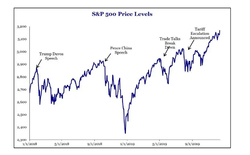 Markets also reacted to the twists and turns of the US trade dispute with China. As this trade dispute appeared to ease in the latter part of 2019, equity markets rallied globally. This is most apparent in the strong equity rally at the end of the fourth quarter of 2019 as the “Phase 1” China deal became more probable. Not only did news surrounding the trade dispute cause broad directional movements in the equity markets, it also caused significant short-term volatility, as demonstrated by the chart below: