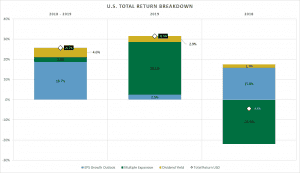 In contrast to tepid US corporate profitability in 2019, US corporate profitability was strong in 2018, with S&P 500 EPS increasing 15.8%, but the index’s valuation multiple decreased 21.9% and drove its total return into negative territory.