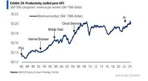 Additionally, the outperformance of the “Magnificent 7” stocks introduces another layer of vulnerability. While their long-term secular growth trends remain intact, their elevated valuations, in conjunction with higher bond yields, highlight the need for investors to consider opportunities among stocks with more attractive valuations. The high valuations on these mega cap companies continue to lean on the premise that they will deliver technologies that improve productivity and drive even further growth across the economy. The exhibit below illustrates the degree to which productivity has been stalled since the Great Financial Crisis.