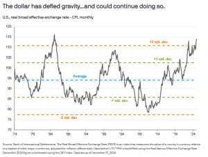 While U.S. equities have certainly experienced a tailwind from both a fundamental and currency standpoint, historically elevated valuations should encourage investors to consider global diversification. It’s true that international stocks saw the largest declines following the election outcome. Some of this was clearly driven by repositioning around the concern of potential tariffs and trade war escalation; however, the strength of the U.S. dollar — which gained 7.6% during the quarter — was the primary culprit for the dramatic underperformance of international stocks during the quarter.