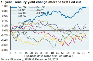 Since the Federal Reserve began its rate-cutting cycle in September, ten-year U.S. Treasury yields have risen, closing the fourth quarter at 4.6% — nearly 80 basis points higher than at the start of the quarter. This trend defies historical patterns, where yields typically decline during cutting cycles and periods of slowing economic activity.