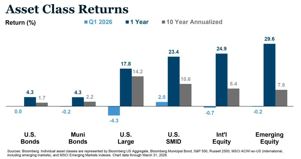 The Asset Class Returns chart below tells a compelling story. While the S&P 500 fell 4.3%, international equities declined just 0.7% and emerging markets only 0.2%, a meaningful divergence that rewarded investors who had maintained broad global exposure rather than concentrating in U.S. large cap. U.S. SMID stocks, at +2.0%, were the best performing equity category for the quarter, a further reminder that diversification within U.S. equities also added value.