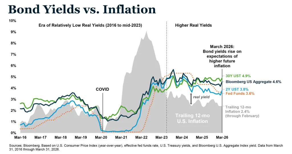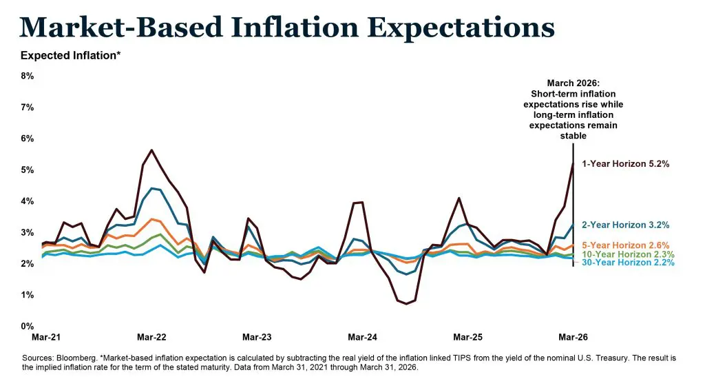 The Market-Based Inflation Expectations chart below adds further context. While short-term inflation expectations rose sharply to 5.2%, longer-term expectations remained anchored near 2.2–2.3%. For fixed income investors, that long-term stability is critical. It suggests that bond markets are not pricing a 1970s-style inflation regime, but rather a near-term energy-driven disruption. If that view proves correct, the current yield environment represents an attractive entry point rather than a risk to avoid.
