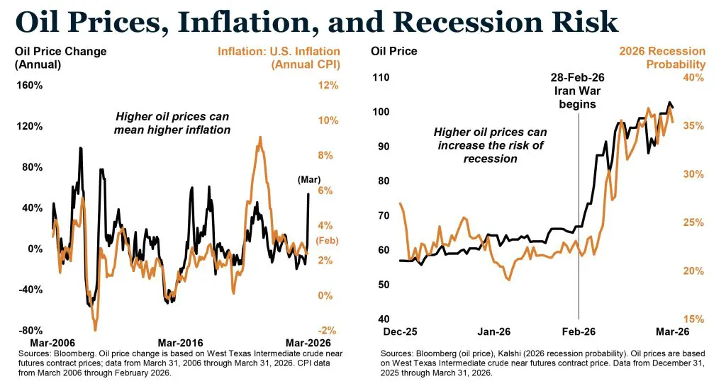 As the below Oil Prices, Inflation, and Recession Risk charts illustrates, WTI crude ended the quarter sharply higher while market-based recession probability climbed from roughly 20% to approximately 35–40%. Futures markets are pricing oil in the $70–75 range by year-end, implying an expectation of de-escalation, but as the chart makes clear, oil prices can deviate significantly from those expectations. We are watching several indicators closely as we move into the second quarter: the resumption of commercial tanker traffic, maritime insurance availability, and U.S. gasoline prices, which were approaching $4 per gallon at quarter end and carry both economic and political weight as midterm elections approach.
