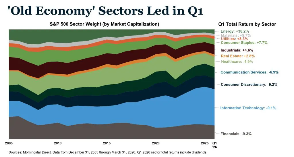 The quarter began with pressure on technology and software stocks, as investors grew increasingly focused on whether artificial intelligence capital spending would translate into durable returns. Then the Iran conflict arrived in late February and reshuffled the leadership deck entirely. As the ‘Old Economy’ Sectors chart illustrates, the rotation was dramatic: Energy surged 38.2% while Financials, Technology, and Consumer Discretionary each fell roughly 9%. In all, six of eleven S&P 500 sectors finished the quarter in positive territory.