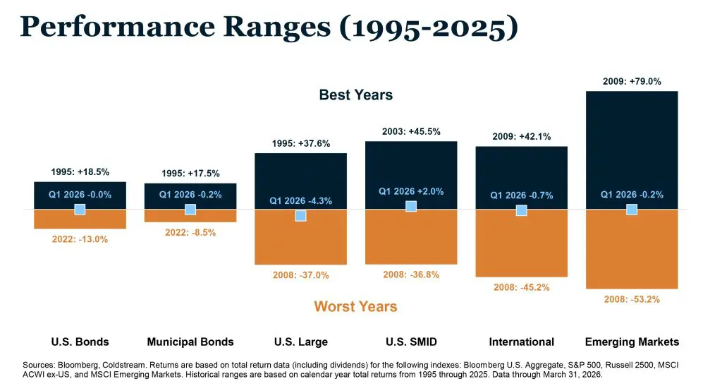 Perspective helps. As the Performance Ranges chart illustrates, Q1 returns across every major asset class landed near the center of their historical annual ranges. The quarter felt turbulent, but by historical standards, it was not.