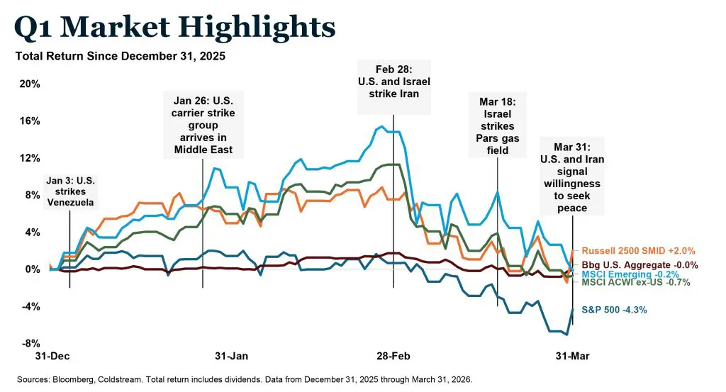 On February 28th, after months of unsuccessful negotiations, the United States and Israel launched coordinated airstrikes on Iran. The Q1 Market Highlights chart below illustrates how the quarter unfolded. Markets, particularly overseas, had actually risen substantially through January and into late February before the strikes triggered a sharp and sustained reversal. What followed was not a single shock but a sequence of escalating events, culminating in Israel’s strikes on Iran’s Pars gas field in mid-March, with only the final day of the quarter bringing any signal of a willingness to negotiate.